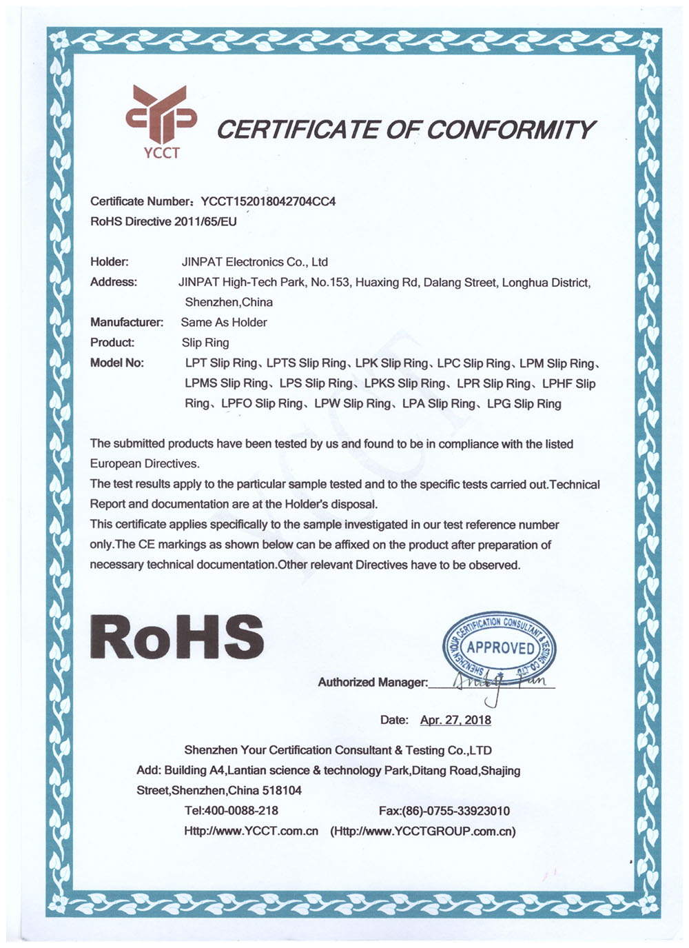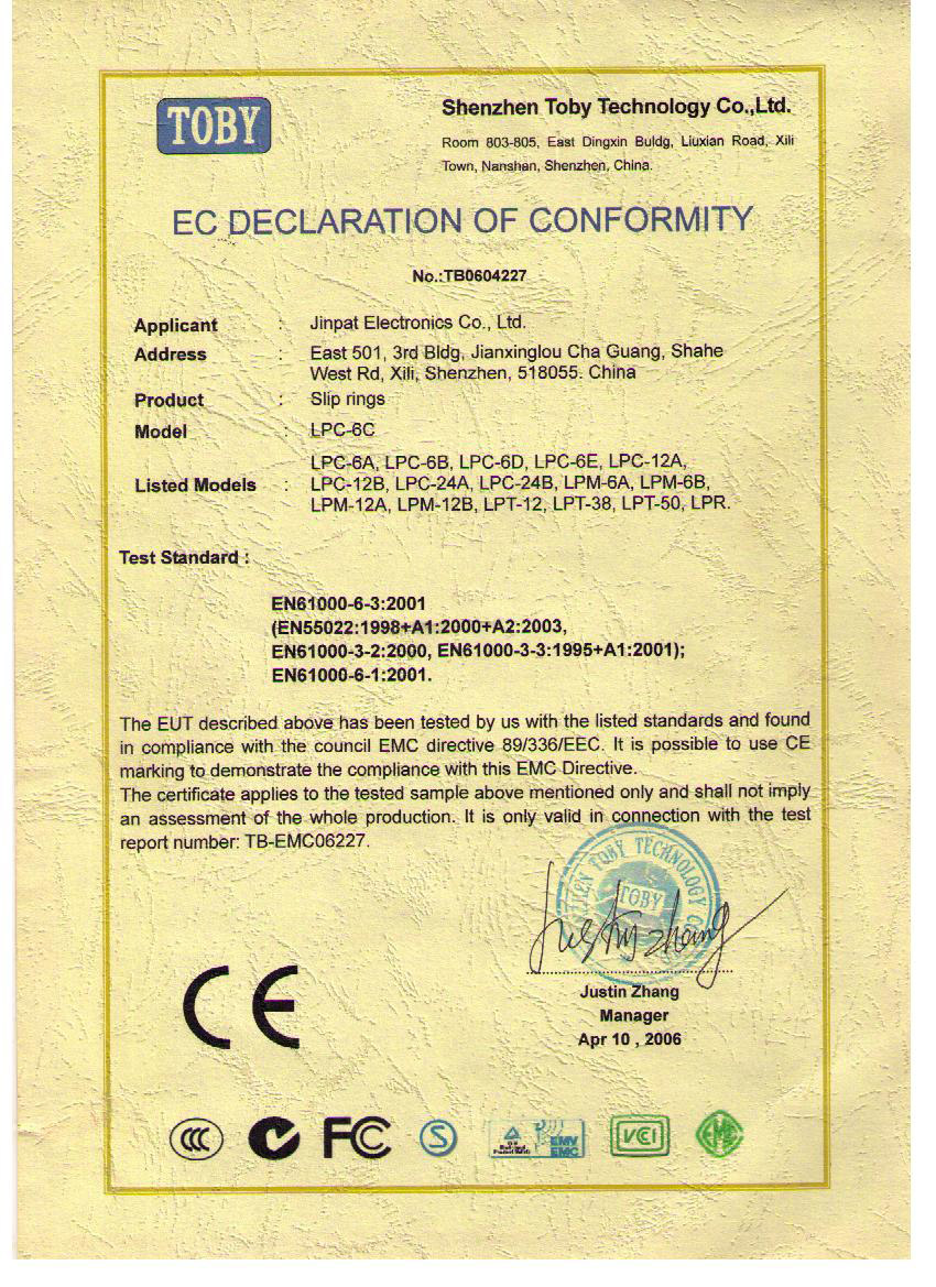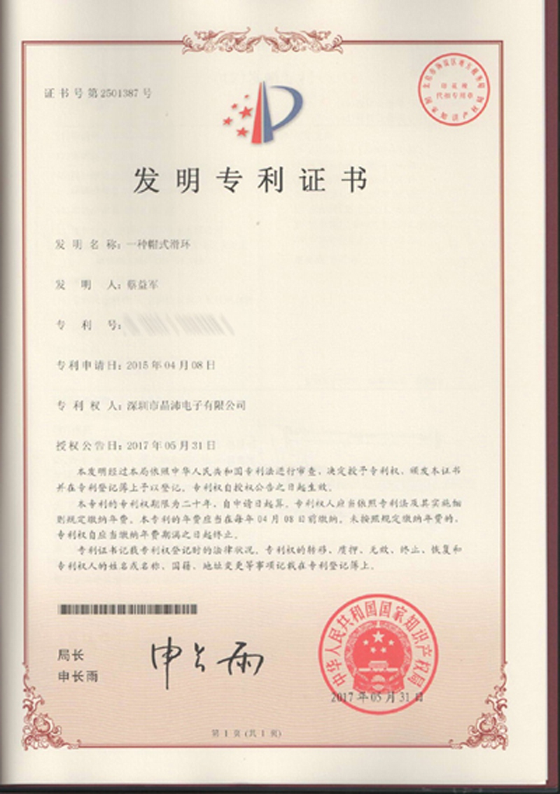 晶沛通過(guò)了歐盟CE認(rèn)證风口浪尖、FCC認(rèn)證参差不齐、SGS認(rèn)證鼓舞人心、BV“船級(jí)社”認(rèn)證、防爆認(rèn)證等多項(xiàng)認(rèn)證,生產(chǎn)的導(dǎo)電滑環(huán)都符合RoHS環(huán)保要求,先后被授予“國(guó)家高新技術(shù)企業(yè)”稱(chēng)號(hào),目前已獲得45項(xiàng)專(zhuān)利,其中發(fā)明專(zhuān)利6項(xiàng)。